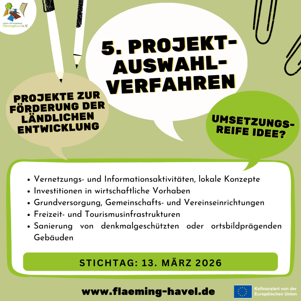 Insgesamt stehen uns in Fläming-Havel für 2023 bis 2027 gut 20,5 Mio. Euro EU-Mittel zur Verfügung. Nach bislang vier Auswahlverfahren wurden gut 80 Projekte mit rund 11,5 Mio. Euro EU-Mittel Förderbedarf ausgewählt.